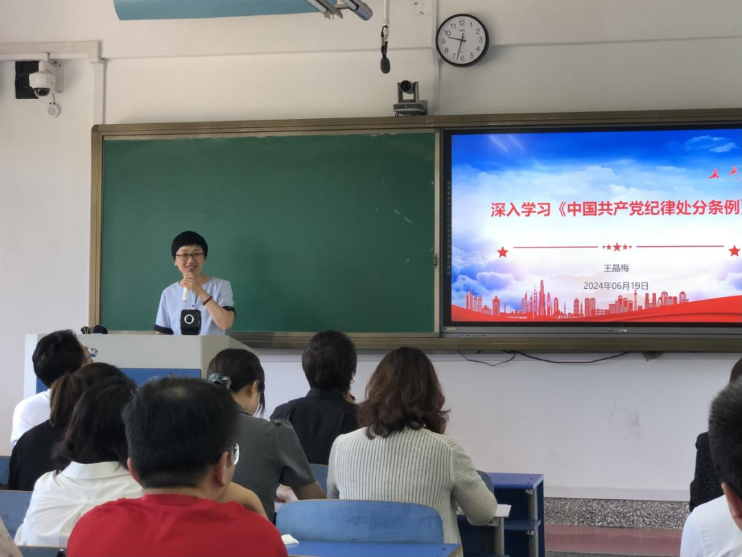 为深入贯彻落实习近平总书记关于党纪学习教育的重要讲话和重要指示精神,进一步加强党风廉政建设,营造风清气正的育人环境,我院于6月19日在2-512教室,开展了由学院党总支纪检委员王晶梅主讲的党纪学习教育专题党课。学院全体师生党员聆听了党课。