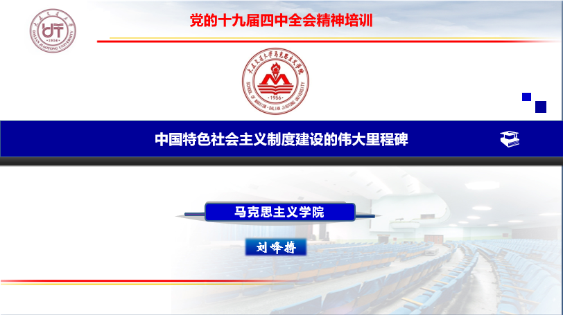 刘峰搏院长以“中国特色社会主义制度建设的伟大里程碑”为题,从“党的十九届四中全会主题的由来”、“伟大里程碑的历史意蕴”、“应对风险挑战的现实考量”等三个方面为学院全体教师做了关于党的十九届四中全会精神的学习体会交流。