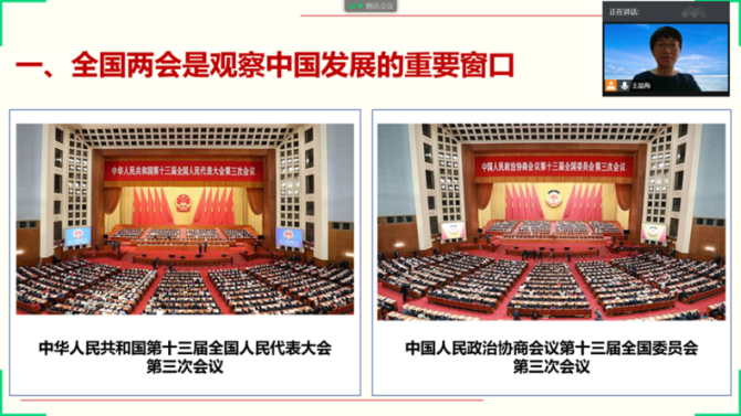 王晶梅老师以“两会制度彰显中国政治优势”为题,从“全国两会是观察中国发展的重要窗口”、“基于制度视角审视2020年全国两会”和“两会制度彰显中国特色民主政治优势”三方面为学院全体教师做了关于2020年全国两会精神的学习体会分享。
