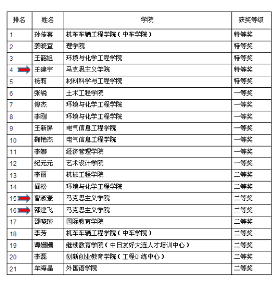 马克思主义学院在本次比赛中成绩突出,共有三人获奖。其中,王建宇老师获特等奖,曹淑豪、邵建飞二位老师获二等奖,获奖等级和人数均创新高。