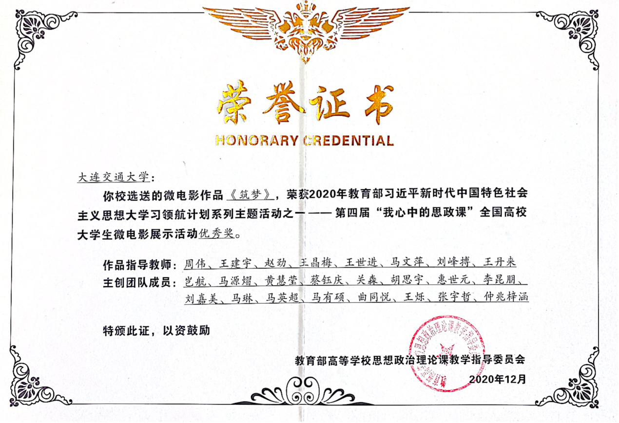 近日,在“教育部2020年习近平新时代中国特色社会主义思想大学习领航计划系列主题活动”中传来捷报,由我校马克思主义学院报送的作品《筑梦》在第四届“我心中的思政课”全国高校大学生微电影展示活动中荣获优秀奖。
