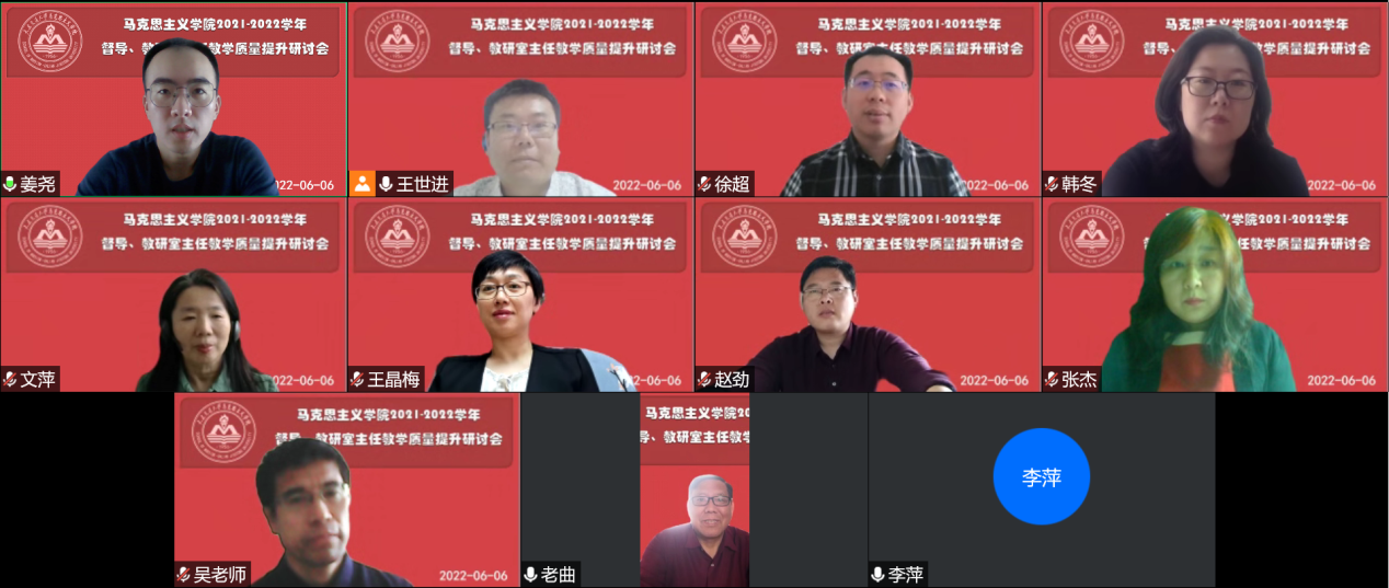 6月6日下午,我院召开2021-2022学年督导、教研室主任教学质量提升研讨会。会议以线上形式进行,参加人员为学校督导、学院督导和教研室主任共11人,由副院长王世进主持。