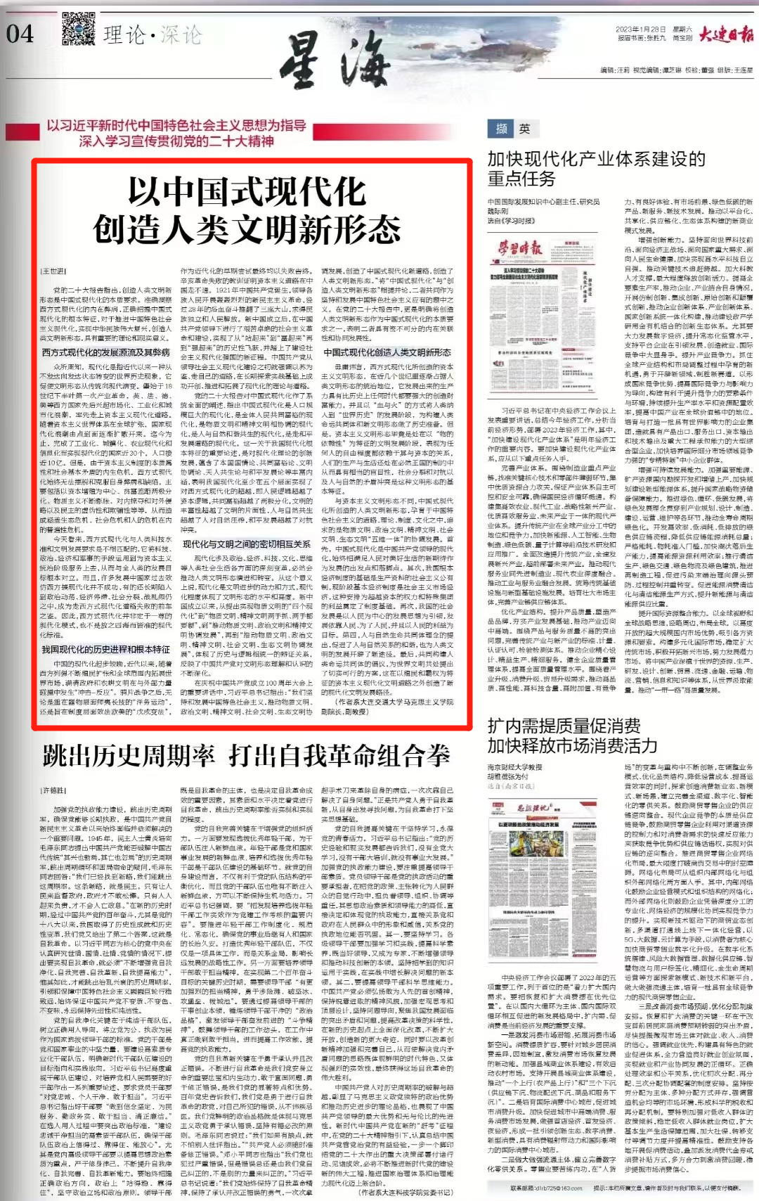 1月28日《大连日报》刊发我院副院长王世进撰写的理论文章《以中国式现代化创造人类文明新形态》。