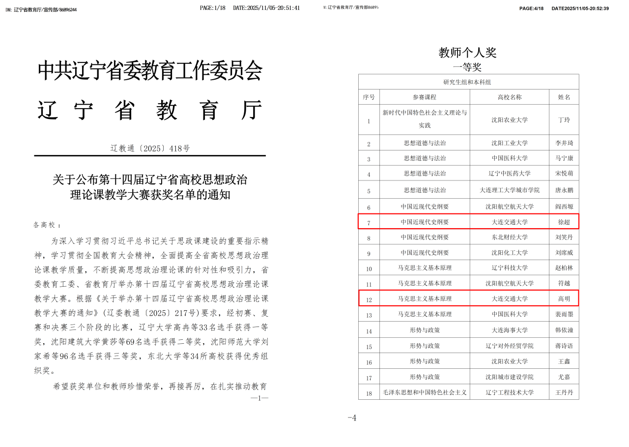 近日,由中共辽宁省委教育工委、辽宁省教育厅主办,教育部大中小学思政课一体化共同体等单位联合承办的 “第十四届辽宁省高校思想政治理论课教学大赛决赛” 在沈阳落幕。我院教师徐超、高明凭借过硬实力脱颖而出,双双斩获本科组一等奖。