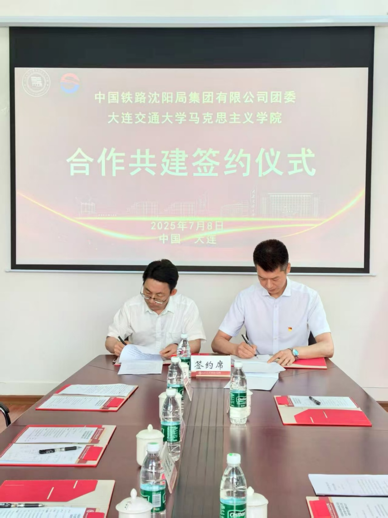 7月8日上午,马克思主义学院与中国铁路沈阳局集团有限公司团委合作共建签约暨揭牌仪式在马院楼201会议室举行。沈阳局集团团委书记潘佳宁、党校常务副校长潘辉、团委组织部部长刁文博出席活动。校团委书记李林、马克思主义学院领导班子全体人员参加了签约和揭牌仪式,仪式由学院党总支副书记刘灿娟主持。