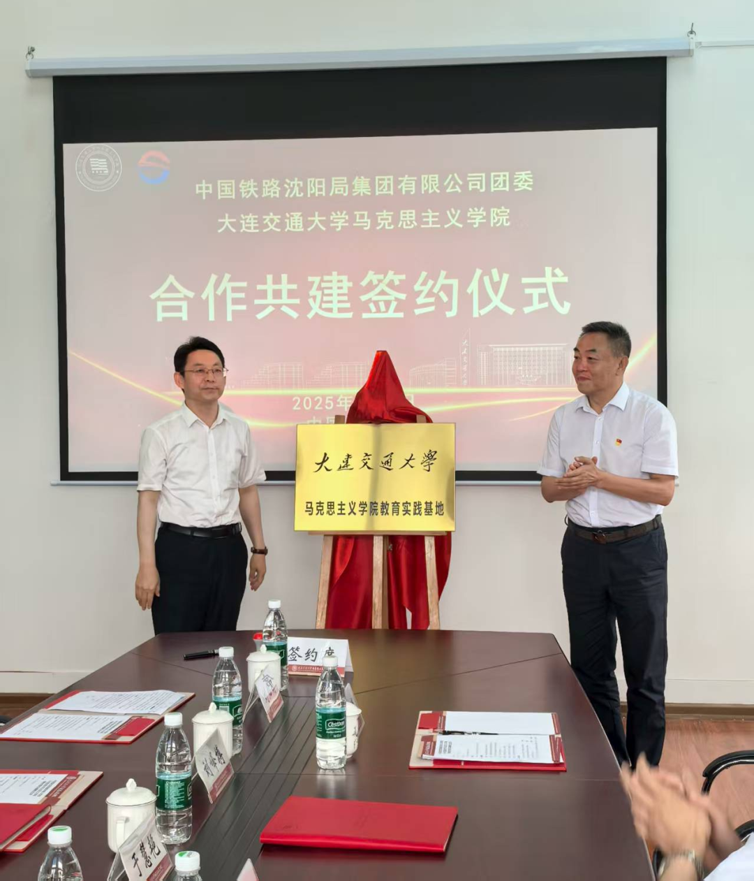 仪式上,潘佳宁与刘峰搏代表双方签署合作意向书,明确将围绕教育培训、课题研究、人才培养三方面展开深度合作。随后,潘辉与刘峰搏共同为“大连交通大学马克思主义学院教育实践基地”揭牌,标志着院企协同育人迈入实质化阶段。