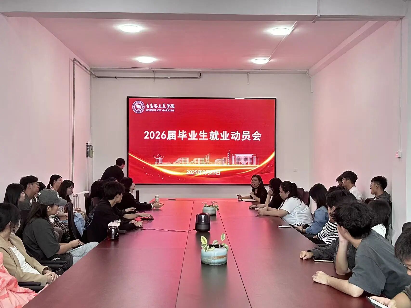 为扎实推进2026届毕业生就业工作,帮助毕业生就业早谋划、早启动,在求职路上找准方向,9月23日马克思主义学院召开2026届毕业生就业动员会。学院邀请学校招生与就业处副处长赫贵怀、2025届毕业生李根进行分享,学院党总支书记于慧艳、党总支副书记刘灿娟、团委书记何婧及2023级、2024级全体学生参加会议。会议由学院党总支副书记刘灿娟主持。