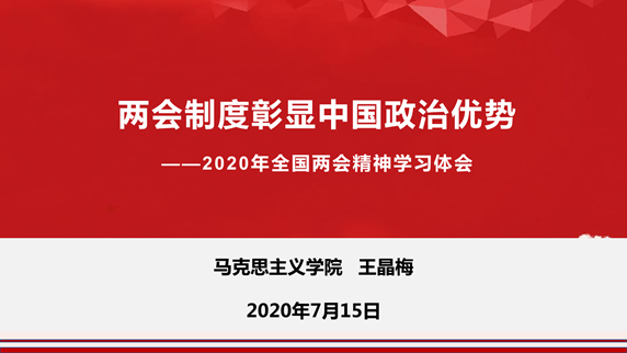 王晶梅老师以“两会制度彰显中国政治优势”为题,从“全国两会是观察中国发展的重要窗口”、“基于制度视角审视2020年全国两会”和“两会制度彰显中国特色民主政治优势”三方面为学院全体教师做了关于2020年全国两会精神的学习体会分享。