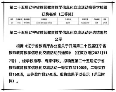 我院中国近现代史纲要教研室王建宇老师微课:《论<历史终结论>的终结》在第二十五届辽宁省教师教育教学信息化交流活动高等教育组荣获微课类三等奖。该比赛于2021年5月起开展,根据《辽宁省教育厅办公室关于举办辽宁省第二十五届教育教学信息化交流活动的通知》,我校组织了“第二十五届辽宁省教师教育教学信息化交流活动”作品校内评选,并按要求报送相关作品。本次获奖作品报送国家平台交流展示。